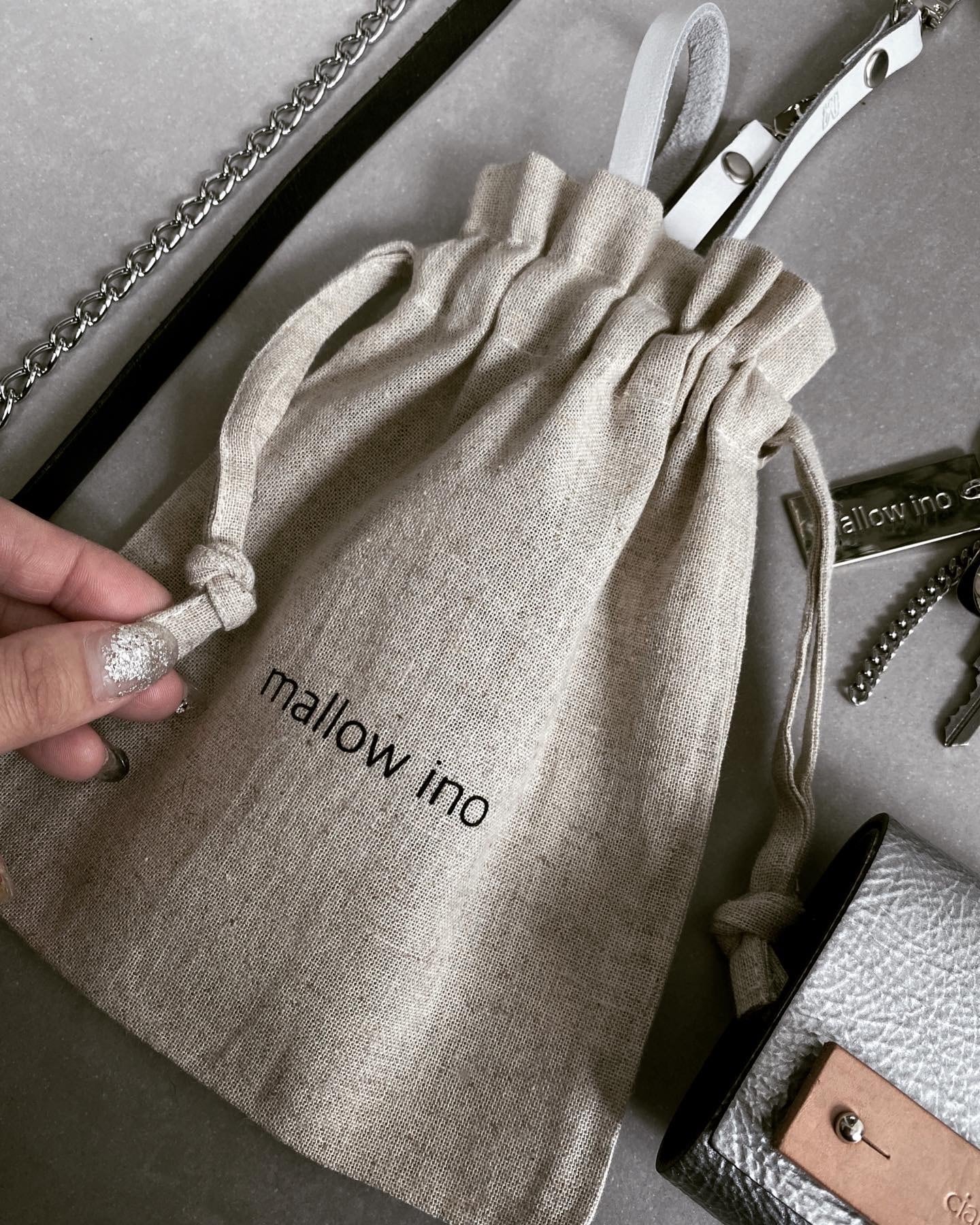 mallow inoオリジナル巾着 リネンとコットンの混合生地 使い込むほどに柔らかい風合になります バッグの中の小物整理などに! 《size》 21×17cm マチなし